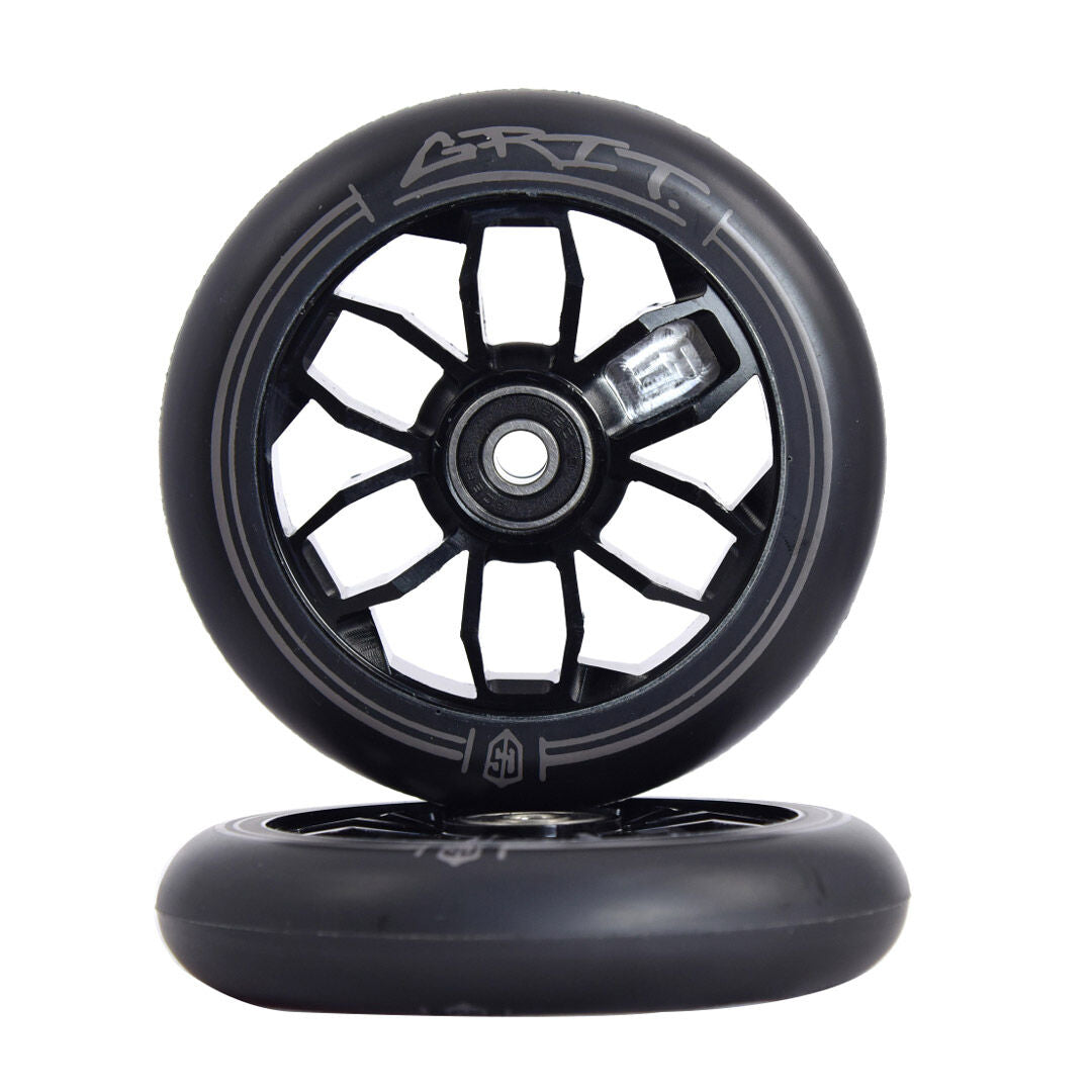 Grit 110x24mm Black Alloy core/Black PU Wheels (pair) Grit Pro Scooters is at the forefront of the scooter riding scene in Australia and quickly became one of the fastest growing Pro Scooter brands in the world. Grit Pro Scooters offers a range of top quality scooter wheels, designed and tested in Australia by our pro riders, and built to the highest standard. When you’re landing huge tricks, your wheels take the stress. Alloy core wheels are therefore the perfect choice for doing tricks, they are hard-wearing, and suited to those who are looking to do stunts due to their durability compared to nylon core wheels. Key Specs: 110mm x 24mm 5 Alloy core spokes ABEC 9 Bearings 88a Urethane Will fit all 110mm wheeled scooters Customising your wheels adds style that will make your scooter be the envy of all your mates.